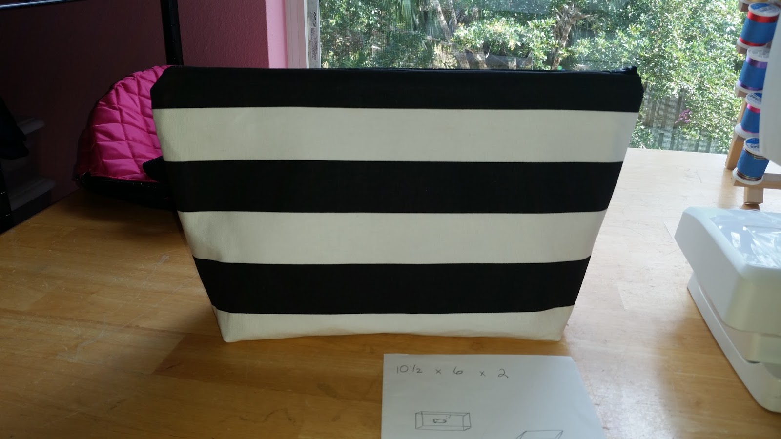 When I'm not coveting fancy fridges I do have a project in the works at my middle daughter's request. She has a bag full of art supplies that she totes around with her. There are pencils, sharpeners, charcoal, exacto knives, erasers, and well, lots of other things in her pathetic beaten up gallon sized ziploc bag. She told me a while ago that she could use something different so I'm trying a few things out. I'm using a new item for me, iron on vinyl, and working out a pattern for a zippered bag with a lined interior for easy clean up for her.